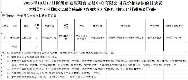 文件下載:2025年10月17日大埔縣2025年縣級(jí)動(dòng)態(tài)儲(chǔ)備成品糧(食用大米)采購及代儲(chǔ)包干輪換費(fèi)用公開招標(biāo)公告