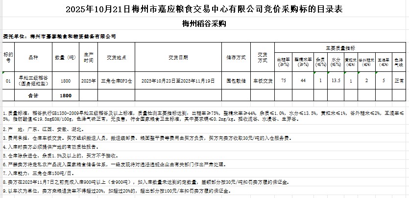 受客戶委托,梅州市嘉應(yīng)糧食交易中心有限公司定于2025年10月21日(星期二)舉辦糧食競價(jià)交易會。梅州市嘉泰糧食和物資儲備有限公司擬采購2025年產(chǎn)早秈稻谷1800噸。