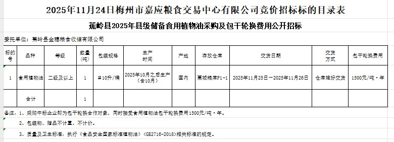 蕉嶺縣2025年縣級儲備食用植物油采購及包干輪換費用公開招標(biāo)公告