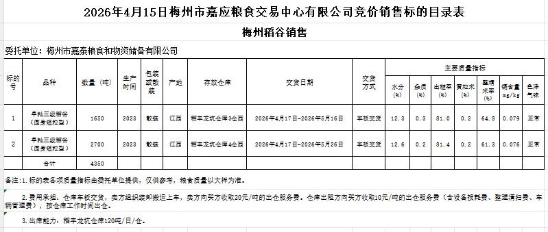 2026年4月15日梅州市嘉泰糧食和物資儲備有限公司稻谷銷售