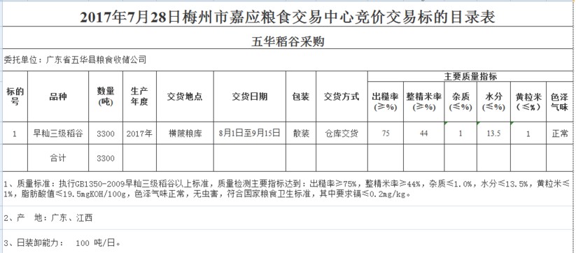 2017年7月28日廣東省五華縣糧食收儲(chǔ)公司稻谷采購