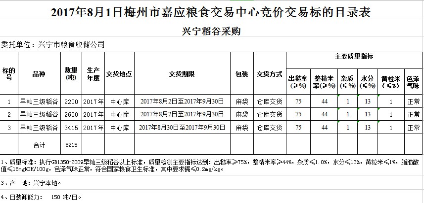 受客戶委托,梅州市嘉應糧食交易中心有限公司定于2017年8月1日舉辦糧食競價交易會,興寧市糧食收儲公司擬采購2017年早秈三級稻谷共8215噸。