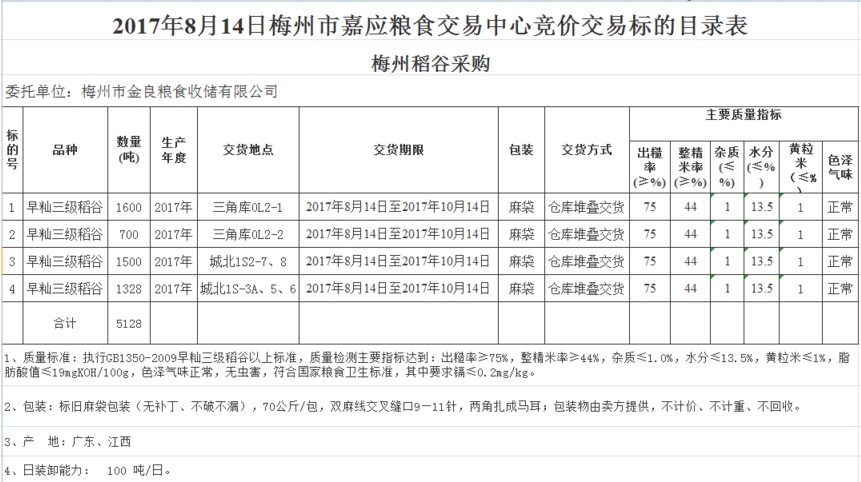 2017年8月14日梅州市金良糧食收儲有限公司稻谷采購