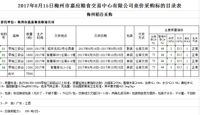 受客戶委托,梅州市嘉應糧食交易中心有限公司定于2017年8月15日舉辦糧食競價交易會,梅州市嘉泰糧食收儲公司擬采購2017年早秈三級稻谷共7504噸。