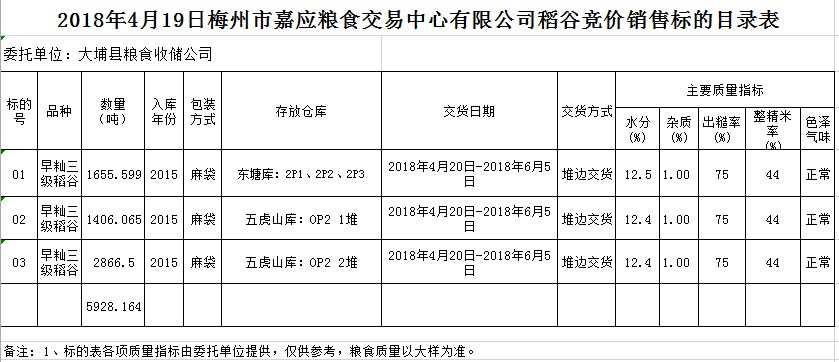 受客戶委托,梅州市嘉應(yīng)糧食交易中心有限公司定于2018年4月19日(星期四)舉辦糧食競(jìng)價(jià)交易會(huì),大埔縣糧食收儲(chǔ)公司擬銷(xiāo)售早秈稻5928.164噸。