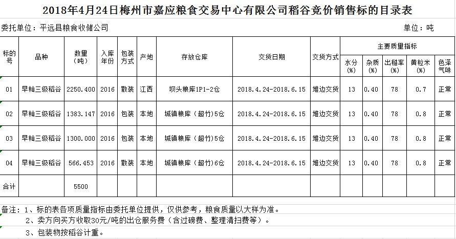受客戶委托,梅州市嘉應(yīng)糧食交易中心有限公司定于2018年4月24日(星期二)舉辦糧食競價交易會,平遠縣糧食收儲公司擬銷售早秈稻5500噸。