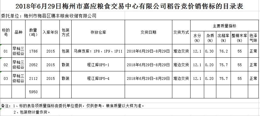 受客戶委托,梅州市嘉應(yīng)糧食交易中心有限公司定于2018年6月29日(星期五)舉辦糧食競(jìng)價(jià)交易會(huì),梅州市梅縣區(qū)穗豐糧食收儲(chǔ)有限公司擬銷售早秈稻5950噸。