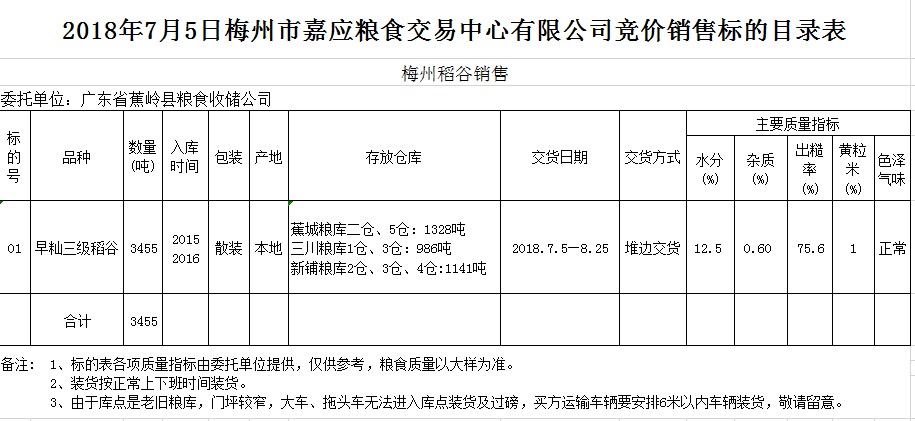 交易時間和地點:2018年7月5日(星期四)上午10時。廣東省梅州市彬芳大道南161號梅州市糧食交易中心3樓。